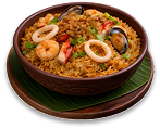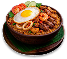 Nasi goreng dihidangkan dengan makanan laut.